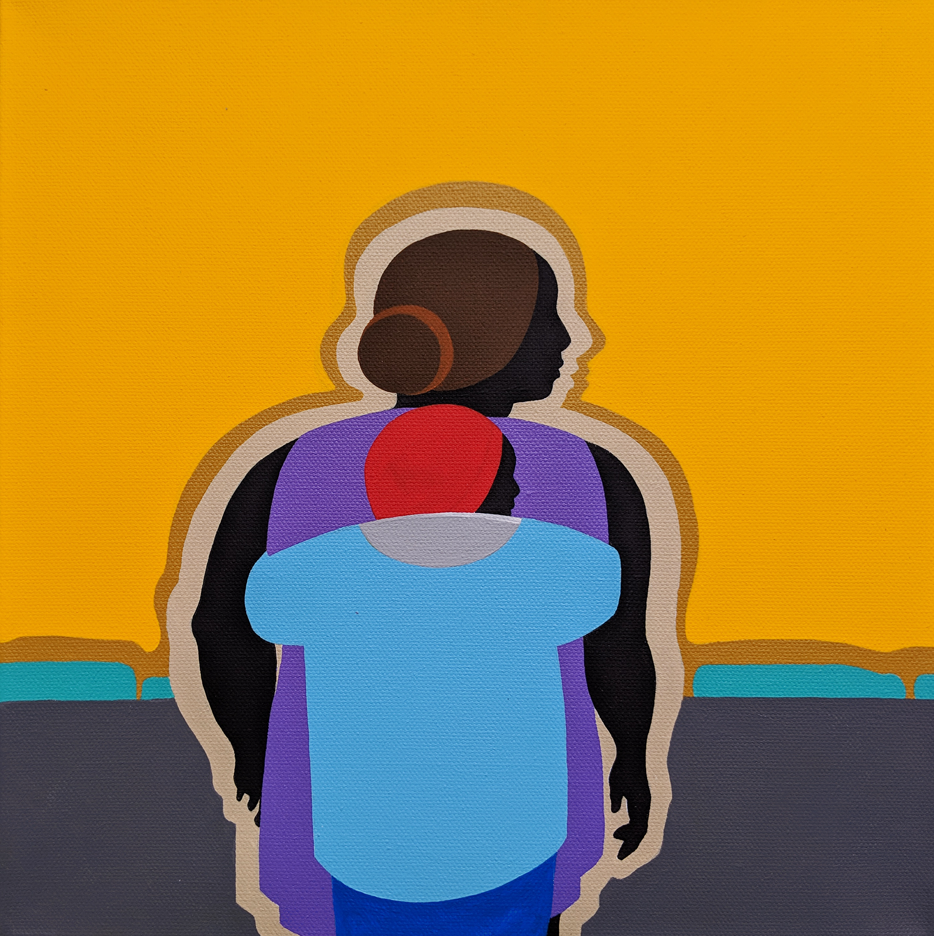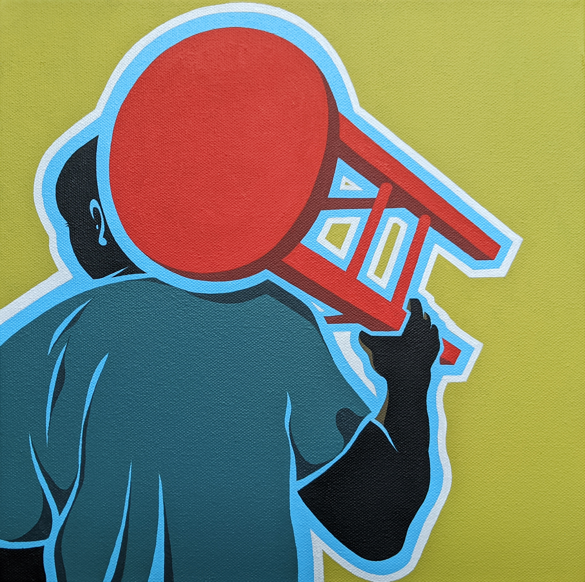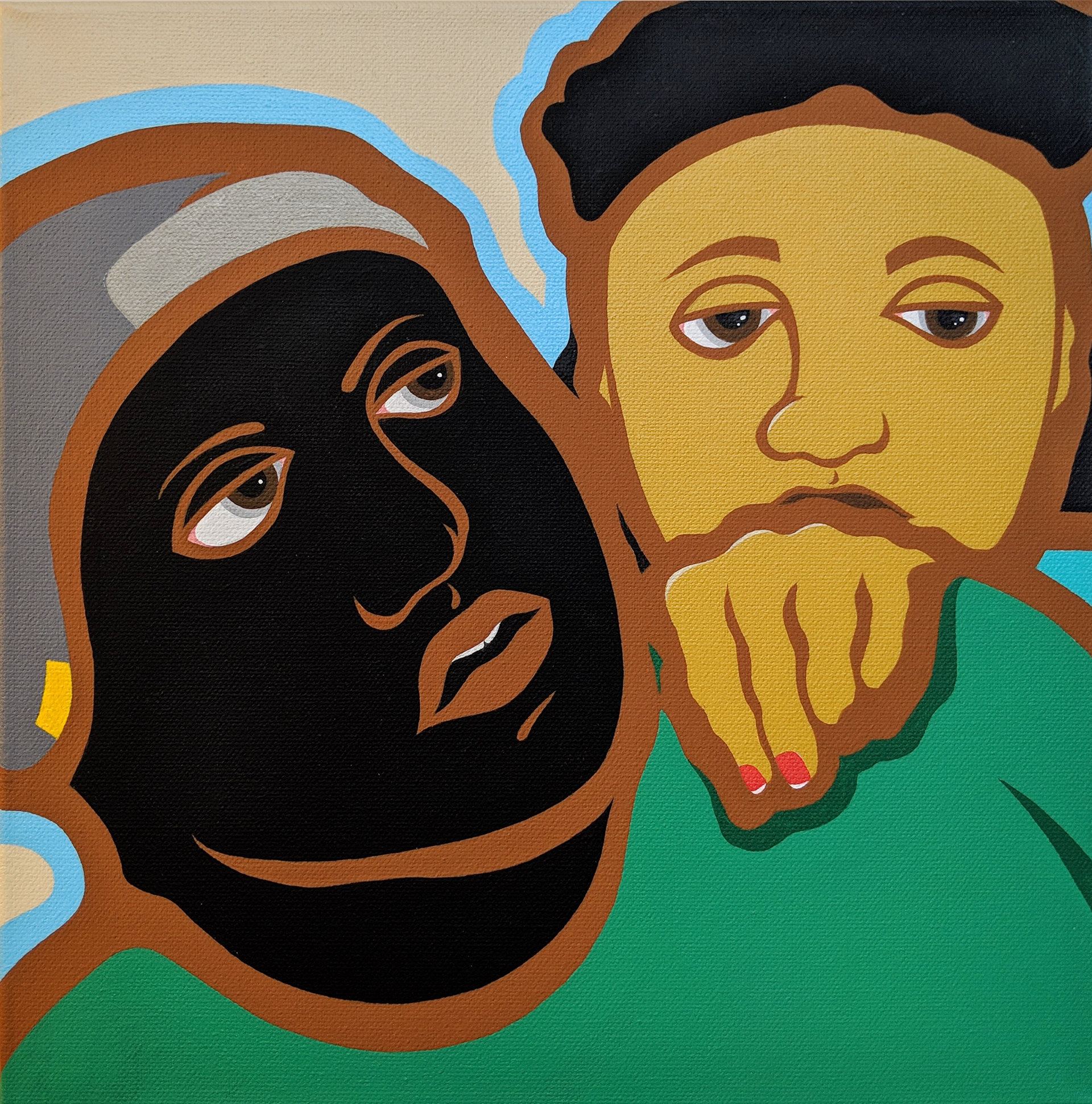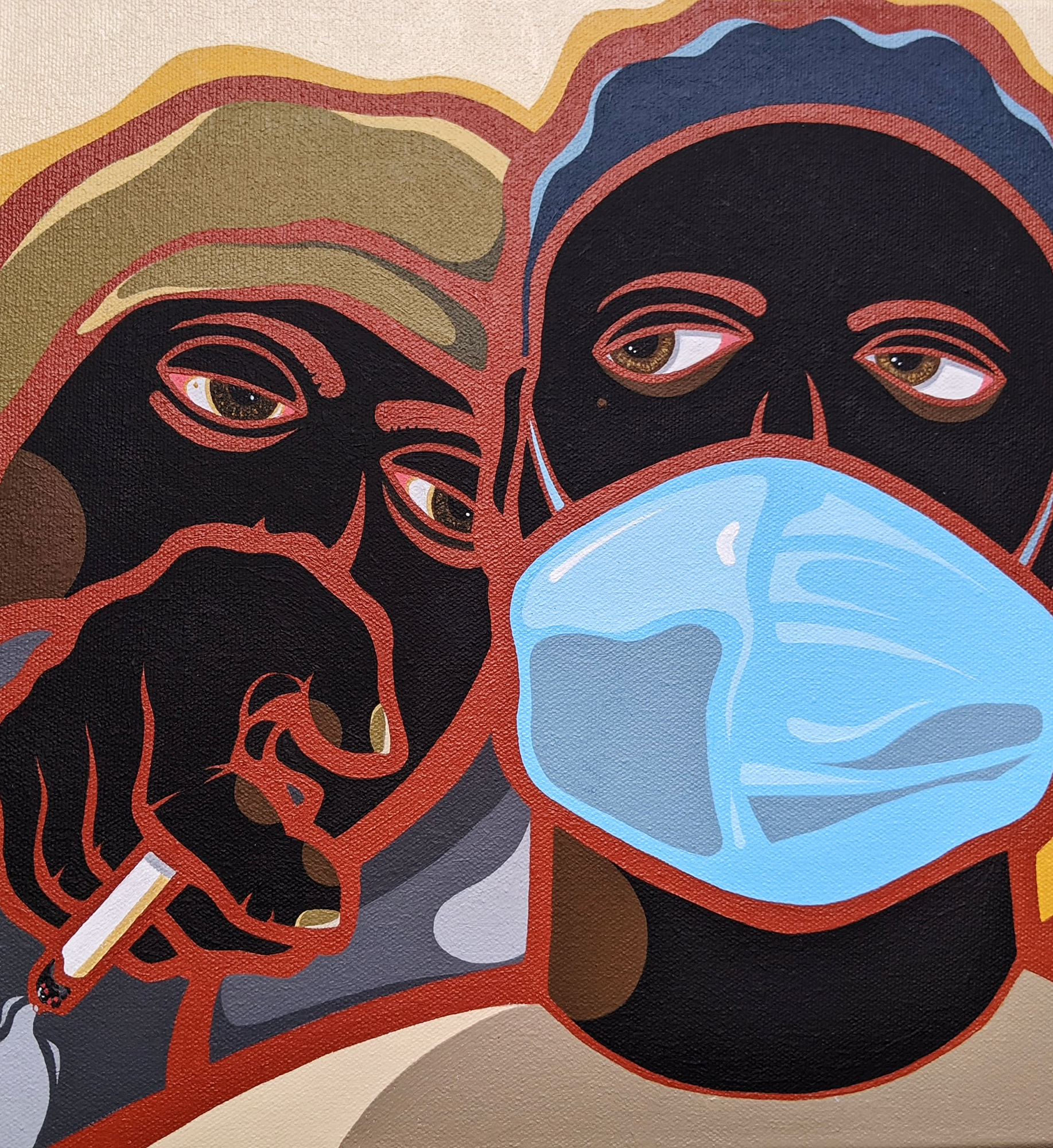 (Left) No Social Distancing, Acrylic Gouache on Canvas, 12 x 12 - (Right) Man With Red Stool, Acrylic Gouache on Canvas, 12 x 12 (Private Collection)