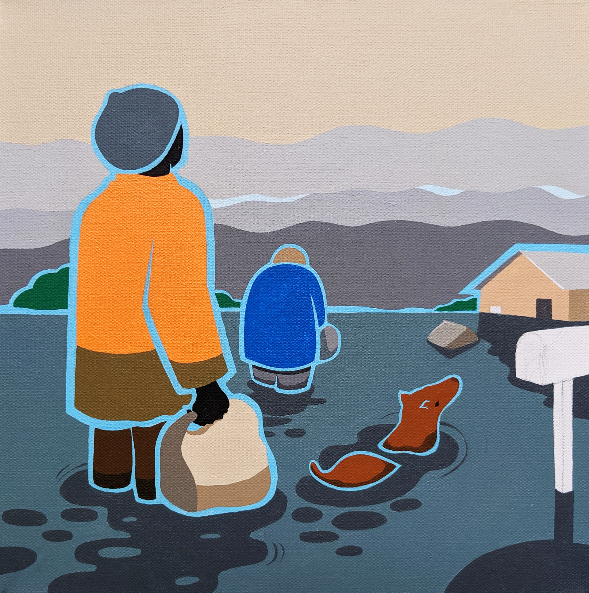 (Left) Deluge, Acrylic Gouache on Canvas, 12 x 12 - (Right) Diner Day, Acrylic Gouache on Canvas, 12 x 12