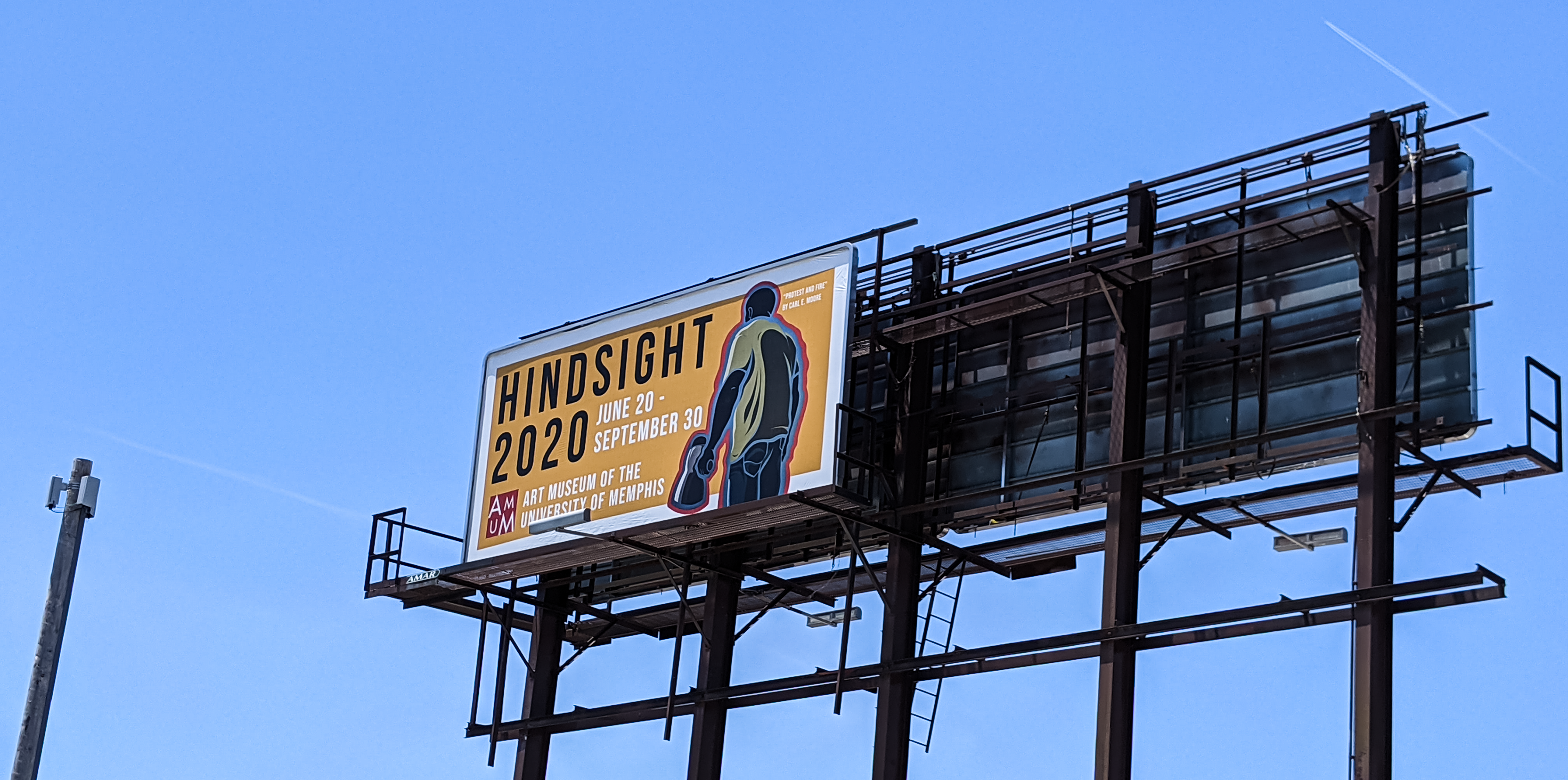 HINDSIGHT Exhibition billboard, Art Museum of the University of Memphis 2020. (Image from painting"Protest and Fire")